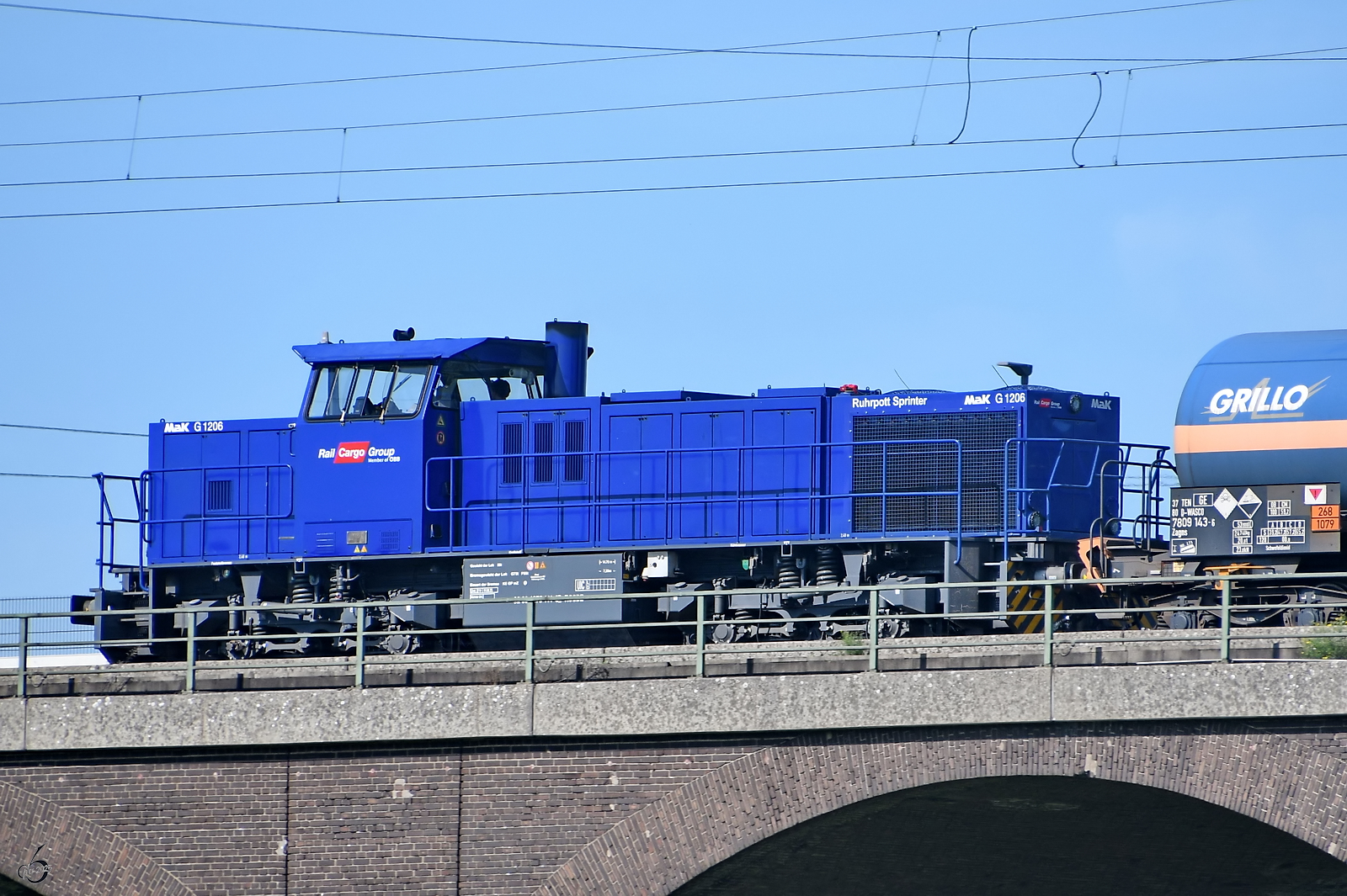 Ende September 2025 zog die Diesellokomotive 1275 111-3 der Rail Cargo Group zwei Kesselwagen über die Duisburg-Hochfelder Eisenbahnbrücke.