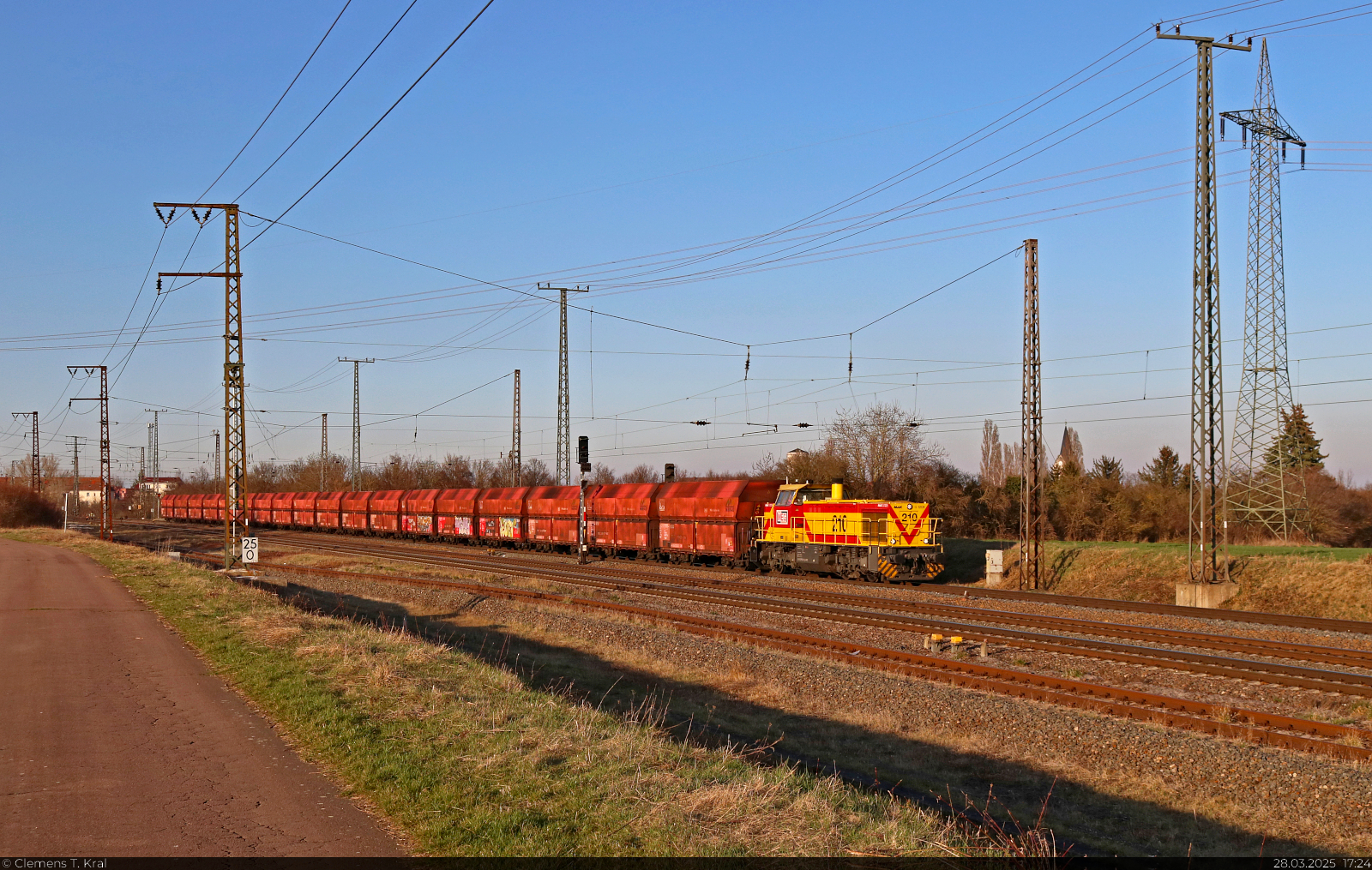 275 210-3 (Lok 210 | Vossloh G 1206) übernimmt einen Kohlependel vom Kraftwerk Schkopau (Buna-Werke) nach Wählitz, wo die Wagen wieder mit Braunkohle bestückt werden. Soeben ist der hier noch alltägliche Zug durch den Bahnhof Großkorbetha gefahren. 🧰 Mitteldeutsche Eisenbahn GmbH (MEG) 🕓 28.3.2025 | 17:24 Uhr