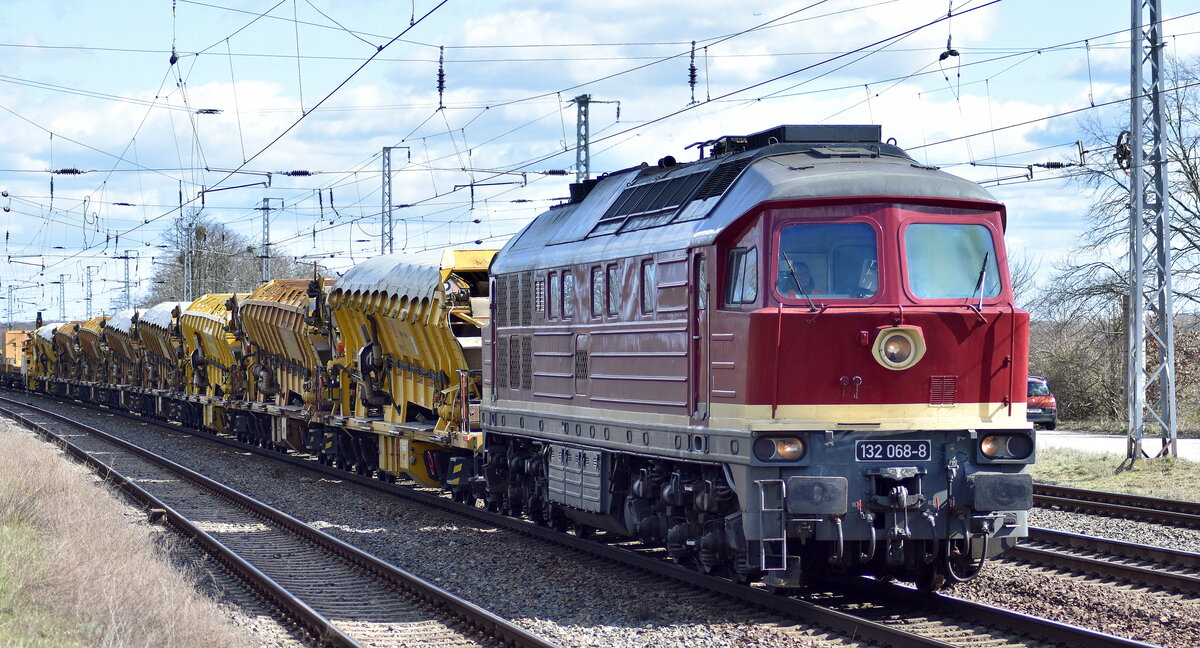 Salzland Rail Service GmbH, Bernburg (Saale) für die DB Bahnbau Gruppe mit "132 068-8" (NVR: "92 80 1232 068-7 D-SLRS") mit einem Gleisbauzug mit P&T MFS Materialförder- und Silowagen der DB Bahnbau Gruppe am 28.03.23 Durchfahrt Bahnhof Saarmund. Lothar Stöckmann