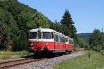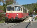 Strohgäubahn: VM 110 MAN vor dem WEG-Bahnhof Weissach. VM 110 war als MAN-Schienenbus ein Sonderfall, der er nach und nach verschiedene Motoren eingebaut hatte, er war eine Mischung aus VT und VS (1983)