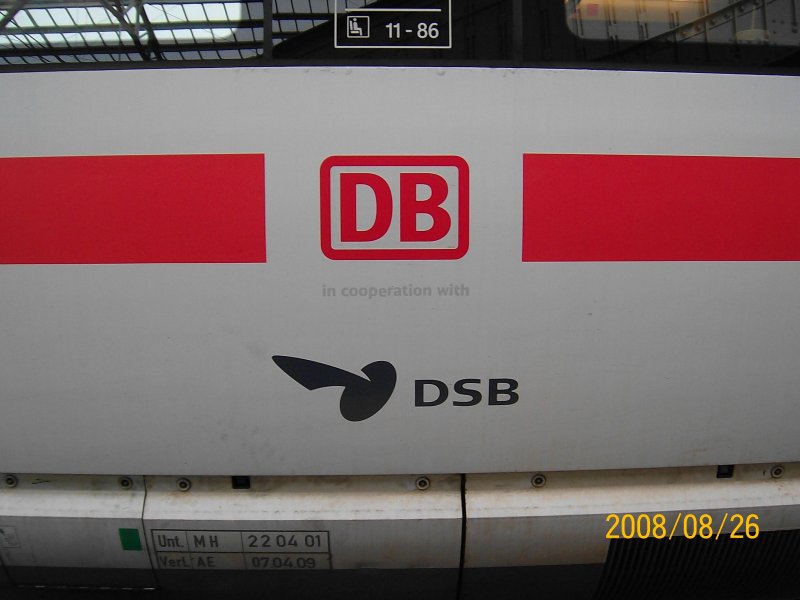 DB in cooperation with DSB  als Seitenlogo am ICE 37 nach Kopenhagen im Lübecker Hbf am 26.08.08.