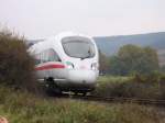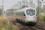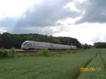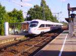Nur wenige Jahre prägten die ICE-TD den Fernverkehr zwischen Deutschland und Dänemark über die Vogelfluglinie. Am Gleisdreieck in Burg auf Fehmarn fährt ein ICE von Hamburg nach Kopenhagen am 29.08.2012 nach Kopenhagen.