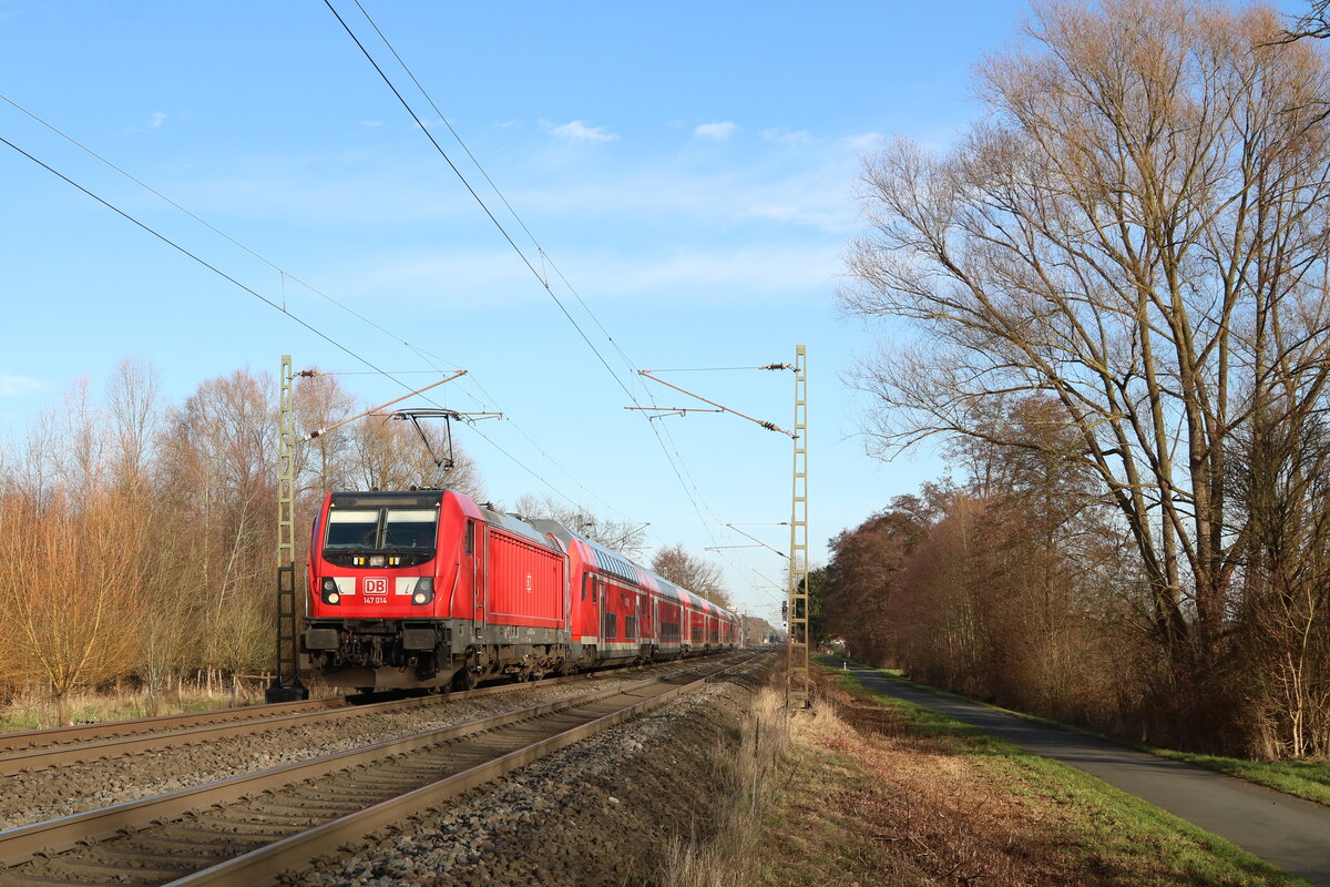 Die beiden aneinandergekoppelten DB-Elektrotriebzüge 1428 007 und 1428 008 sind hier Ende September 2025 auf der Duisburg-Hochfelder Eisenbahnbrücke zu sehen.