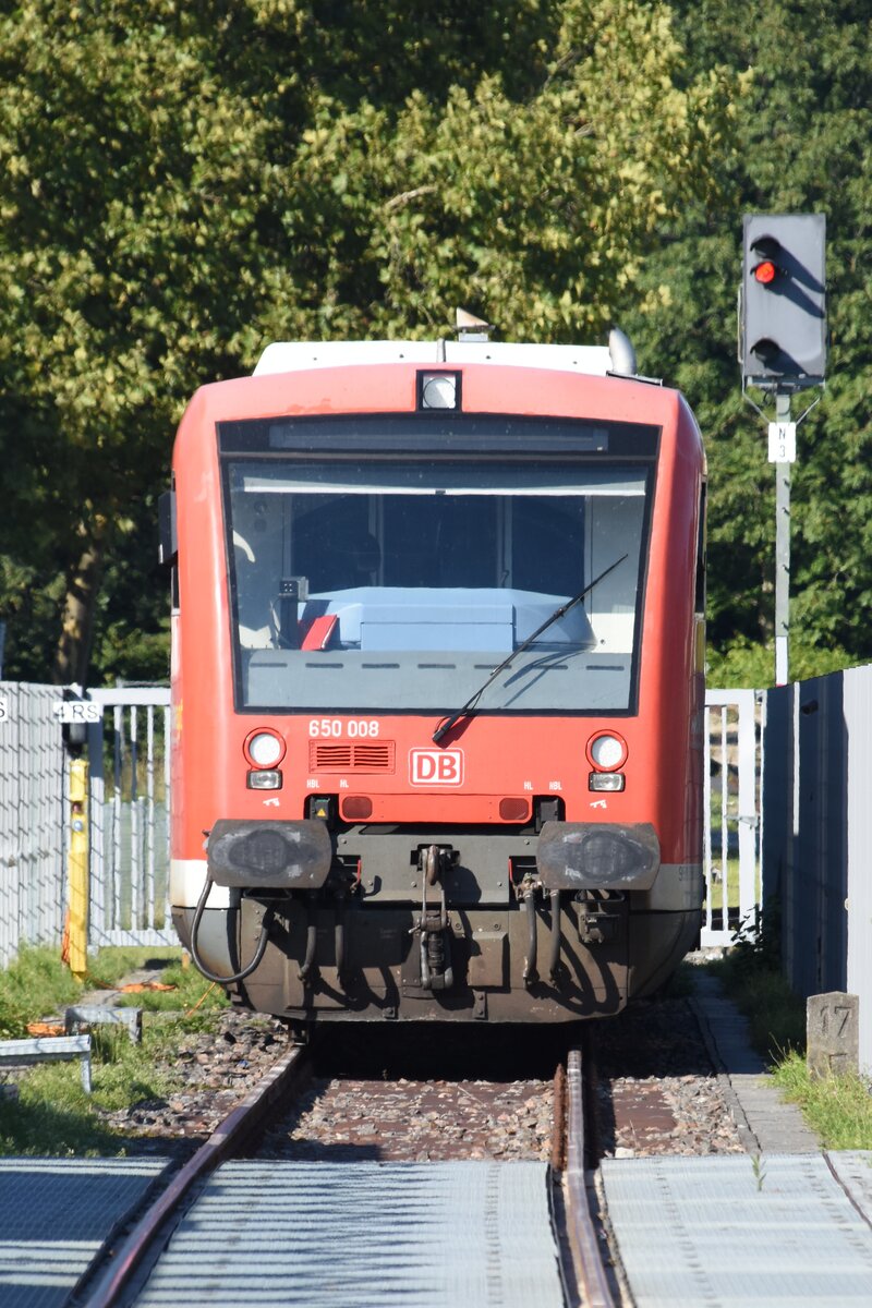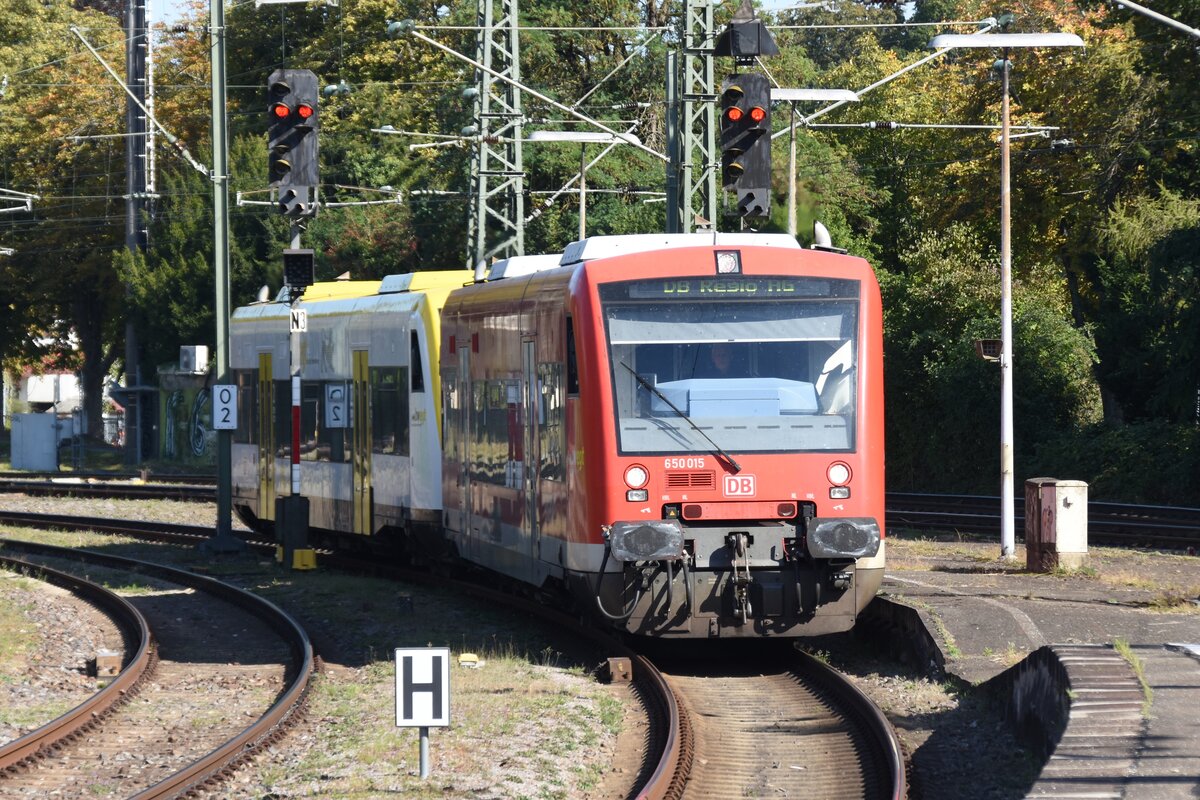 Im badischen Bahnhof Mengen muss der Zug die Kreuzung der Donautalbahnzüge abwarten. Links vorne 650 382 vom Ringzug, hinten das Seehäsle 650 627, rechts fährt 650 116 der DB aus und das Formsignal mit Langsamfahrt darf auch ohne Sonne gezeigt werden.