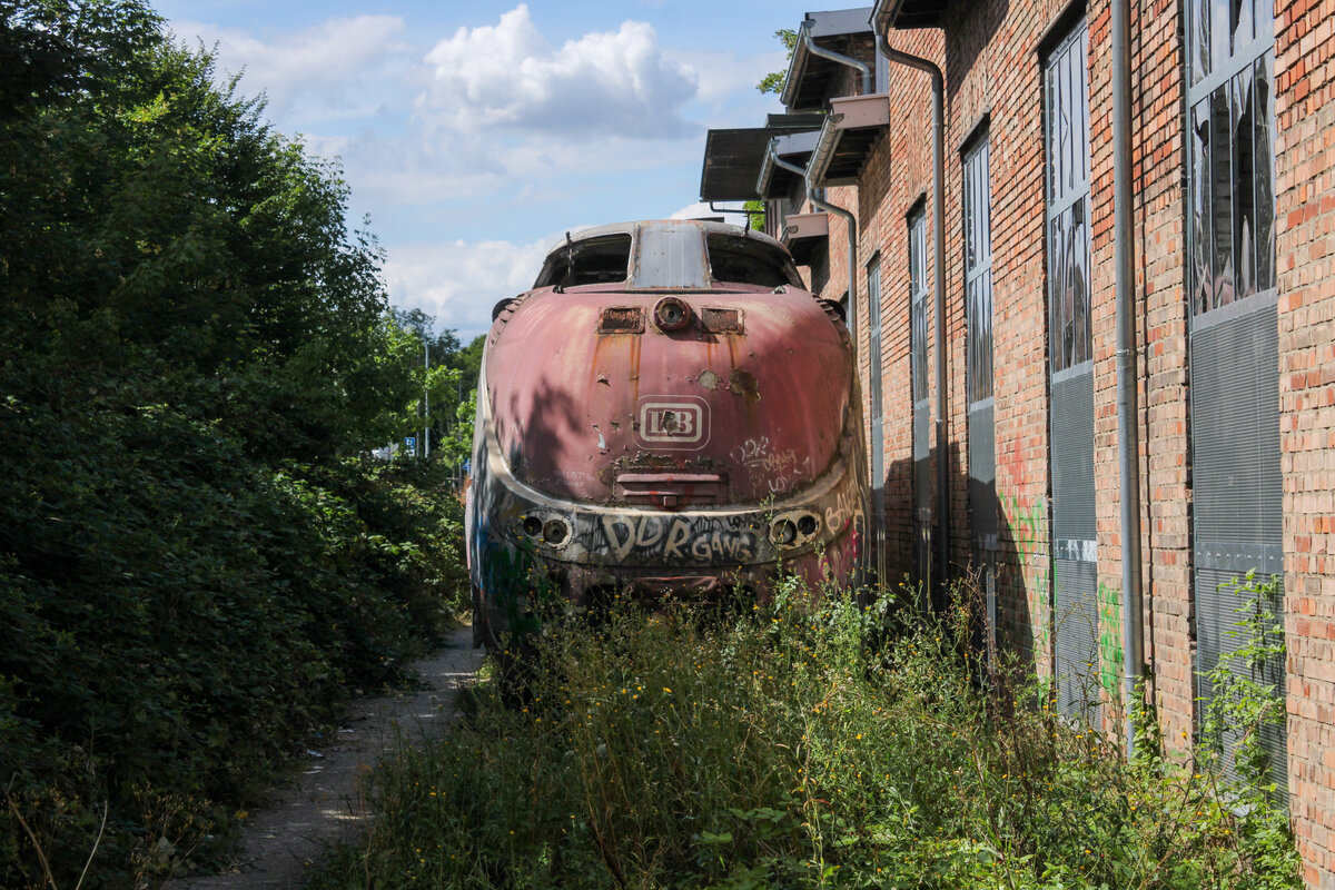 Rückseite des 601 018-5, welcher seit Jahren neben der Triebwagenhalle im ehemaligen Bw Heilbronn verrottet. Das SEH ist seit 2020 Geschichte und das Gelände wurde (mit Ausnahme von 41 073, 601 018 und einer unbekannten Köf II) Anfang des Jahres geräumt. Der Triebkopf ist von einem öffentlichen Weg aus fotografiert(23.07.2025) Leonhard Groß
