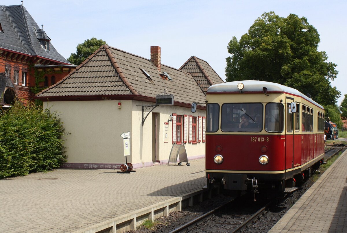 Der Schmalspur-Triebwagen, der vorher in einem Zug von Wernigerode zum Brocken mitgeführt wurde, ist im Bahnhof Drei Annen Hohne entkuppelt worden und fuhr dann weiter nach Eisfelder Talmühle. Im Bahnhof Elend wurde er fotografiert. (16.08.16)
