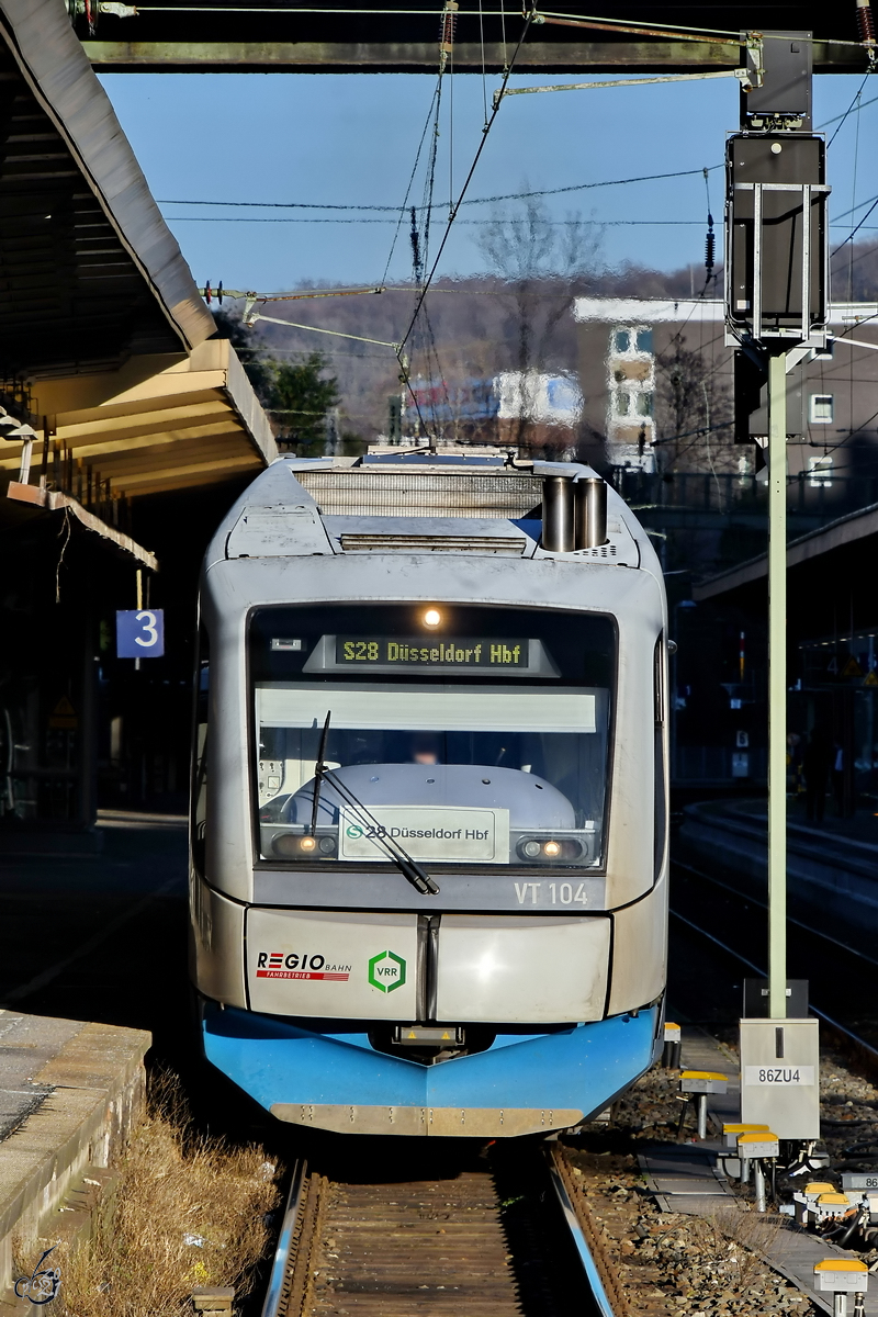 Der Dieseltriebzug VT 104 Mitte Februar 2021 am Hauptbahnhof Wuppertal.