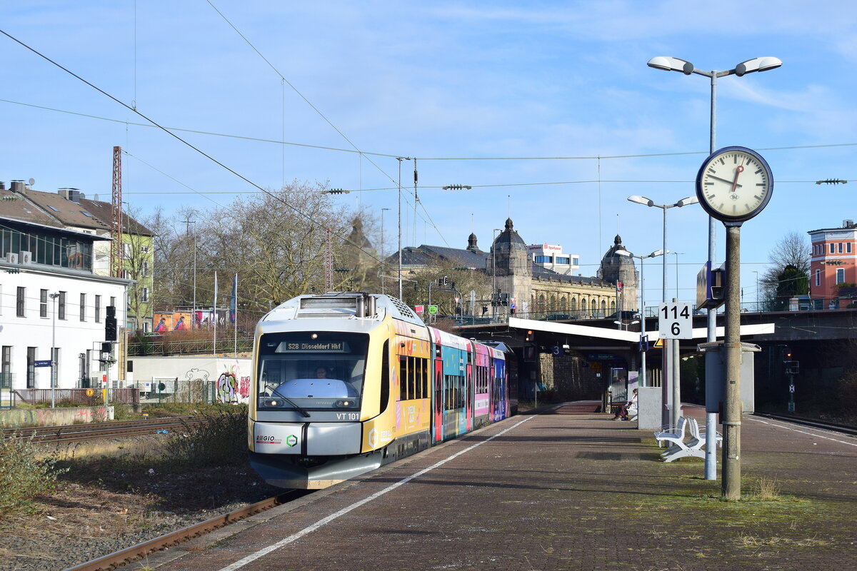 VT 104 fährt als S28 in Wuppertal Steinbeck aus in Richtung Wuppertal Vohwinkel.