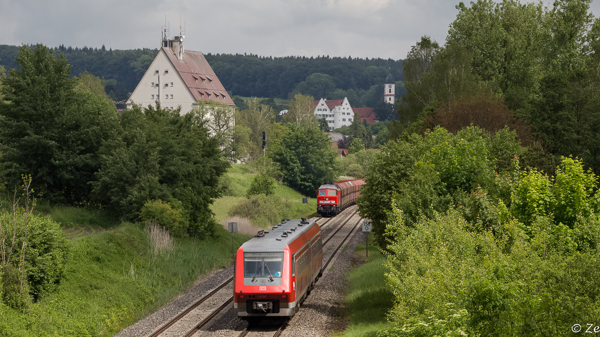 Am 01.06.2016 begegnen sich 232 618-9 mit dem Kieszug Roßberg - Friedrichshafen und 611 006 mit dem IRE-Sprinter in Richtung Ulm Hbf bei Aulendorf-Zollenreute/Rugetsweiler.