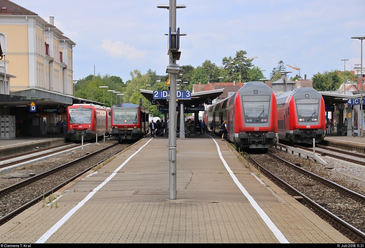 Im Bahnhof Friedrichshafen Stadt geben sich folgende Züge ein Stelldichein (v.l.n.r.):
