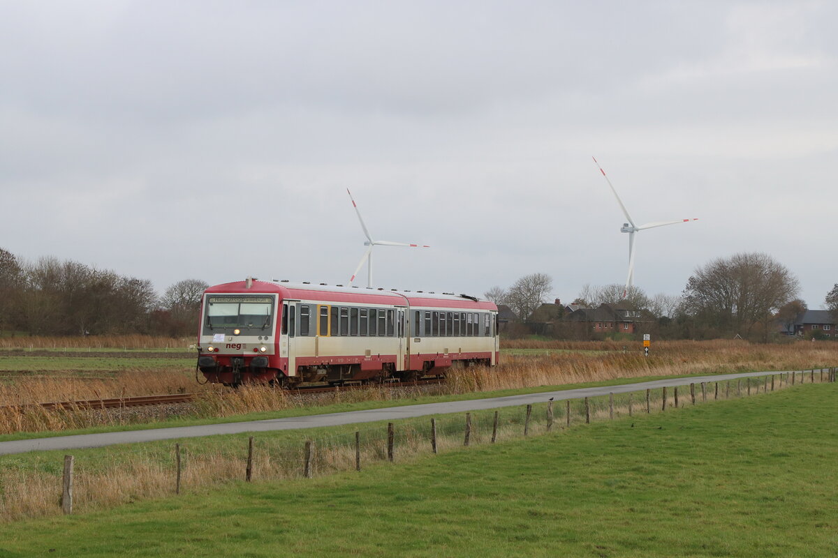 Ein Triebwagen der Baureihe VT628 der NEG auf der Strecke von Niebüll nach Dagebüll-Mole am 2. November 2025 kurz vor dem Erreichen des kleinen Örtchens Dagebüll in Nordfriesland. Jens Hubers