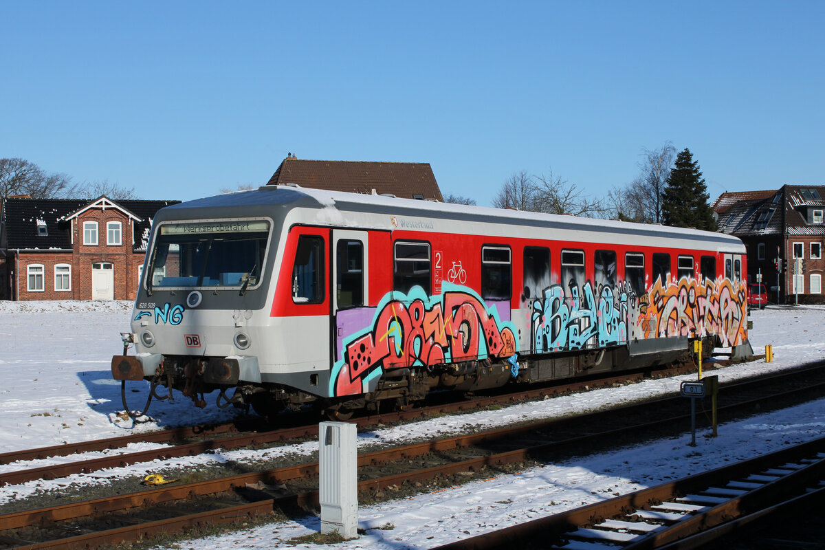 Am 14.02.2026 stand 628 509 in Niebüll. Nach einer Entgleisung im September 2020 wurde der Triebwagen zum Ersatzteilspender. Am 01.08.2025 wurde er ausgemustert. Im Hintergrund ist 928 509 zu sehen.