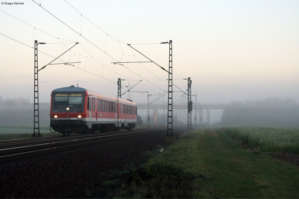 628 655 im morgendlichen Frühnebel auf dem Weg nach Karlsruhe Hbf. Aufgenommen am 09.11.2012 bei Graben-Neudorf.