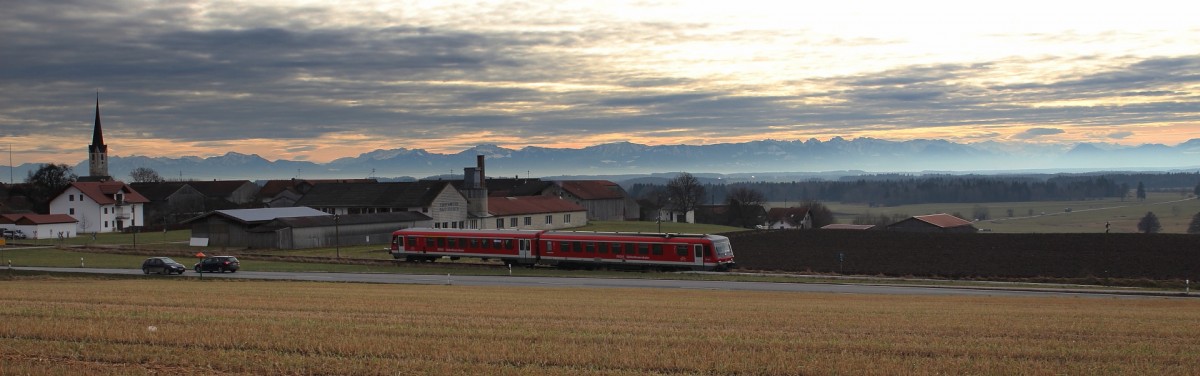 In Tulling hat man einen traumhaften Blick auf das Alpenmassiv, wenn das Wetter stimmt. Da nur ein 628 am Tag zwischen Wasserburg und Grafing Bahnhof pendelt, wartete ich eine lange Stunde auf meine Gelegenheit. Glück hatte ich, daß mir auf der B 304, an welcher stets starker Verkehr herrscht, kein Auto vor die Linse fuhr. 628 446-7 am 16.01.14.