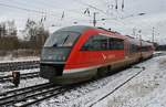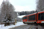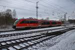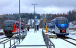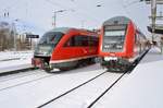 Bahnhof Bad Schandau. Links wartet auf Abfahrt BR 642 035 als U28 nach Decin hl.n., rechts fährt die S1 nach Meißen Triebischtal ein. Die Aufnahme stammt vom 13.02.2018.