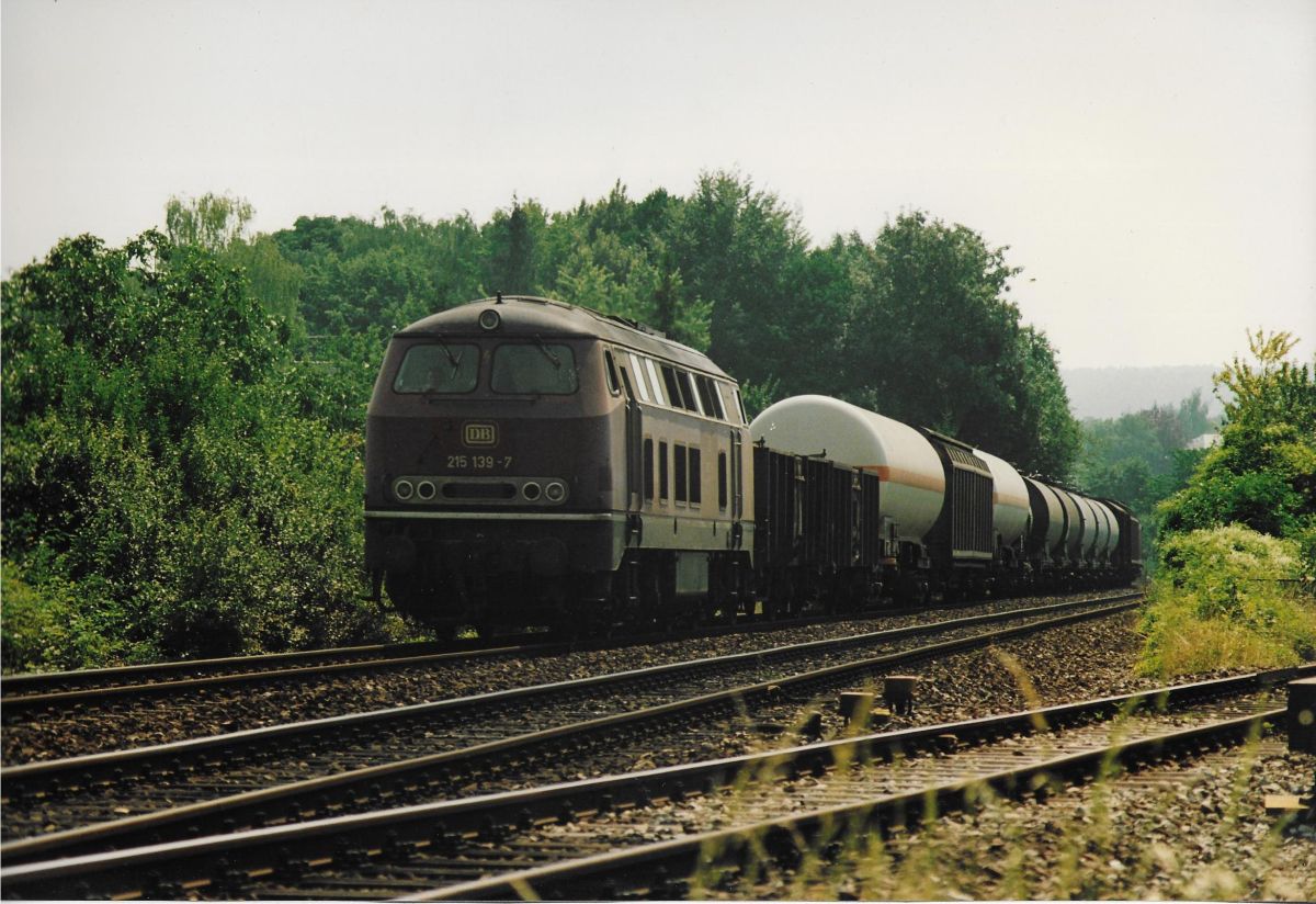 02.August 1990 Abzw.-Stelle Karlstor-Pfühl 215 139-7 mit Dg 53644 von Rbf. Nürnberg nach Rbf.Mannheim in Heilbronn Lokwechsel im Mai 1991 ging sie ins AW NNX am 30.06.1992 erhielt eine B3 REV 15.07.91 kurz nach der Abnahme erlitt Sie einen Brandschaden war länger im AW HBX 30.06.92 Lz 83411 Ulm. am Bild unten die Strecke zum Südbahnhof