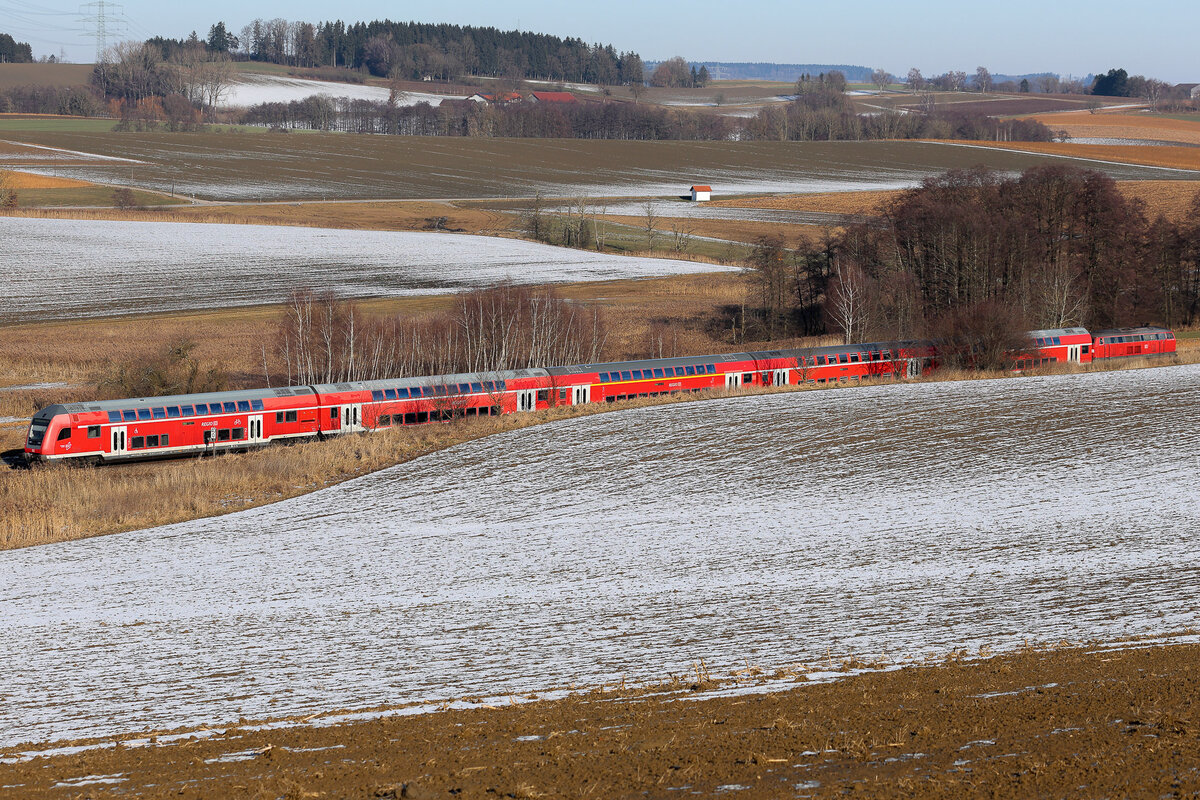 Etwa jede Stunde wird Mühldorf mit München Ost bedient. 245 Loks und Doppelstock Wagen sind die Regel. Ab und zu verirrt sich dann doch nochmal ne 218 dazu. 218 452 schiebt in diesem Fall Richtung München am 19.01.2026. Fotografiert westlich von Dorfen. Flo Weiss