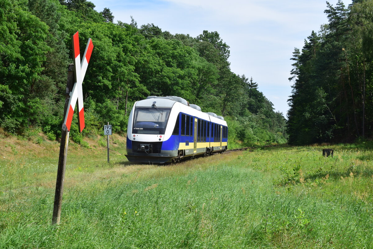 Wald und Wiesenbahn passt im Abschnitt Leitstade doch recht gut zur Wendlandbahn. Hier verlässt 648 293 den Haltepunkt Leitstade.