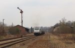 Besuch bei der Bahnstrecke Nossen–Moldava v Krušných horách: Ankunft des RS 1 650 057 mit schöner Werbung für das Streckenjubiläum 2020 im Bahnhof Holzhau, Ende Januar 2026. In Holzhau gibt es seit ca. 2000 nur noch ein Streckengleis. Ich stehe auf dem Zugang zum Bahnsteig. Das auf mich zukommende ehemalige Überholgleis, zu Zeiten, als man hier noch mit V 100 und einem Beiwagen hochfuhr, ist durch eine Gleissperre abgesperrt. Von Holzhau aus geht es nur per Langläufer weiter.