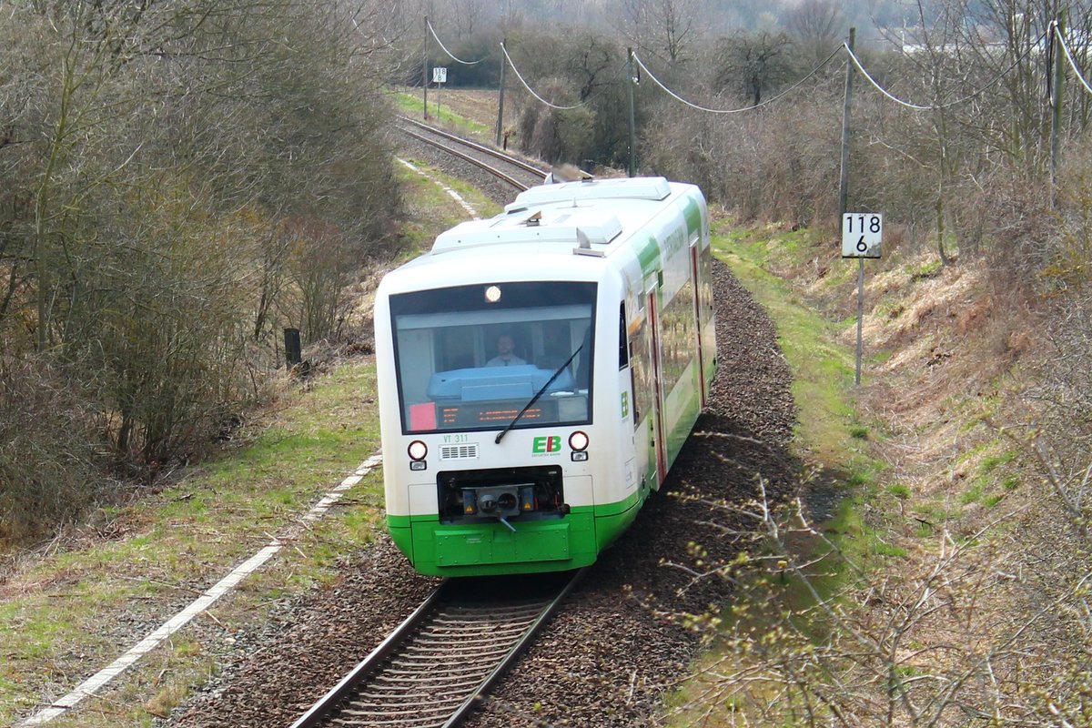 VT 311 der Erfurter Bahn (EB) am 9.4.2021 zwischen Pößneck und Oppurg auf dem Weg nach Leipzig