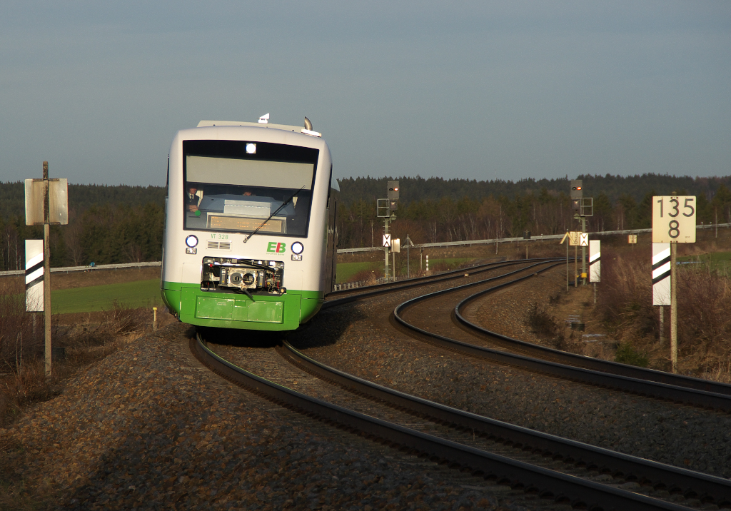 Zwei Regioshuttle ,VT 328 und 317 der Erfurter Bahn (Elster Saale Bahn), sind am eher frühlingshaften 29 Dezember 2012 auf dem Weg durch das Vogtland von Gera nach Hof.