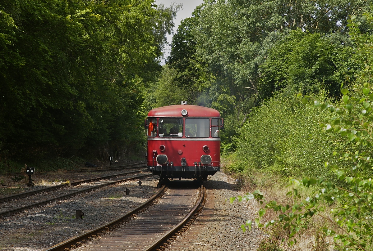 Am 07.08.2021 verlässt 798 729-0 der Kasbachtalbahn Kalenborn in Richtung Linz am Rhein. Früher ging es hier noch rund 26 km weiter über die Höhen des Westerwaldes nach Flammersfeld. Die Stilllegung dieses Streckenteils erfolgte abschnittsweise zwischen 1950 und 1966.