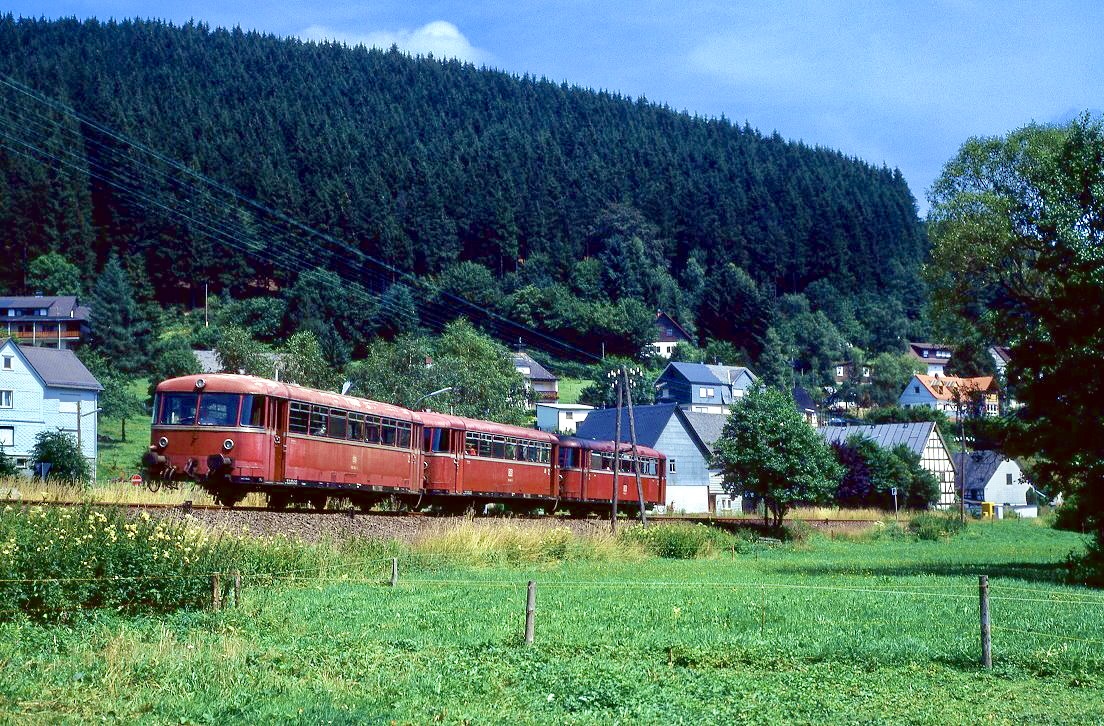 Brückenseile und Fahrleitung lassen den Himmel fast noch interessanter wirken, als den Schienenbus.