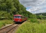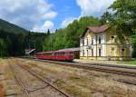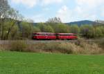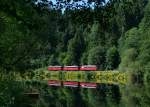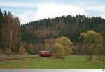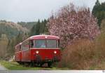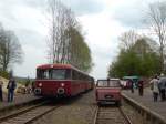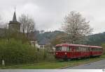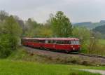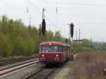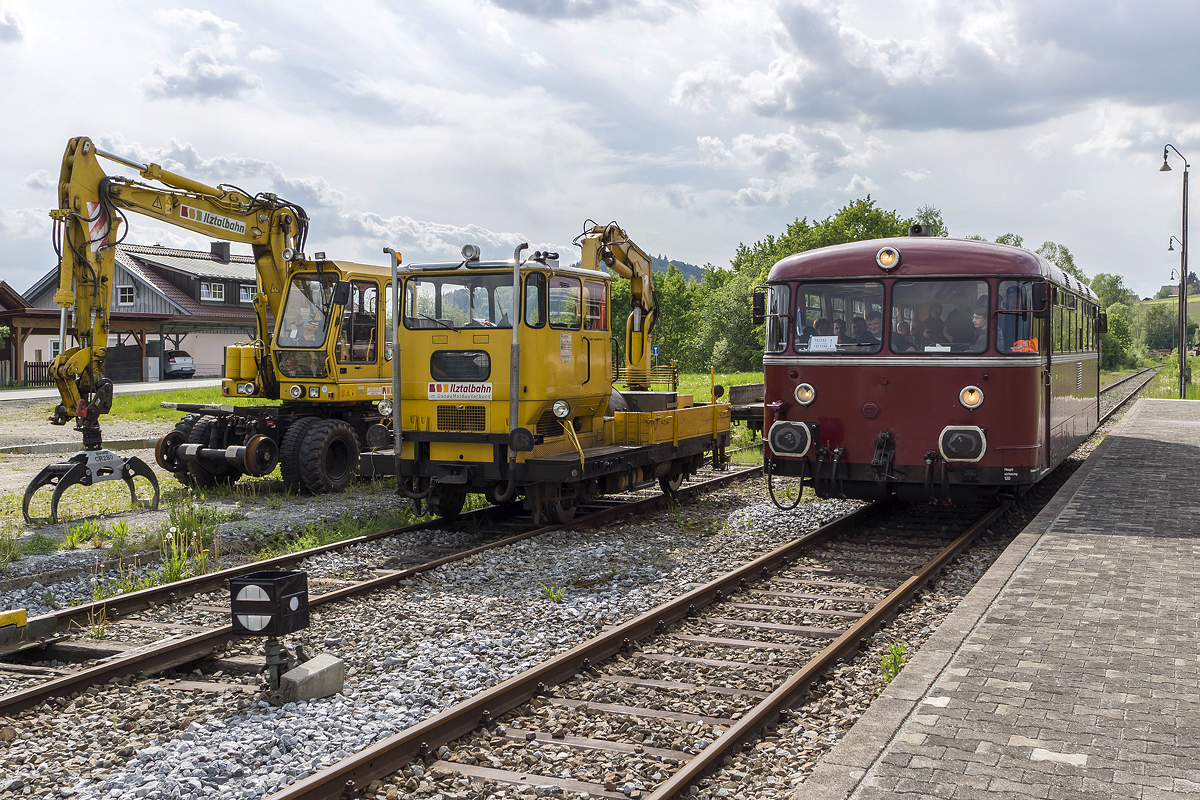 Bei den Nostalgiezugfahrten auf der Ilztalbahn am 14.05.2015 bestreitet ein Zugpaar bestehend aus Uerdinger Schienenbussen den Plandienst im Pendelverkehr zwischen Passau und Freyung. 798 776-1 auf dem Weg nach Freyung hat Einfahrt in den Bf Waldkirchen, um dort mit dem Gegenzug nach Passau zu kreuzen.