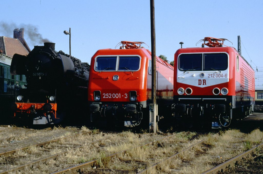 212 004-6, 252 001-3 und 52 8075-5 Bw Wustermark, Juli 1991 (hier wurden Fahrzeuge für eine Fz-Schau in Berlin-Wannsee zusammengezogen).