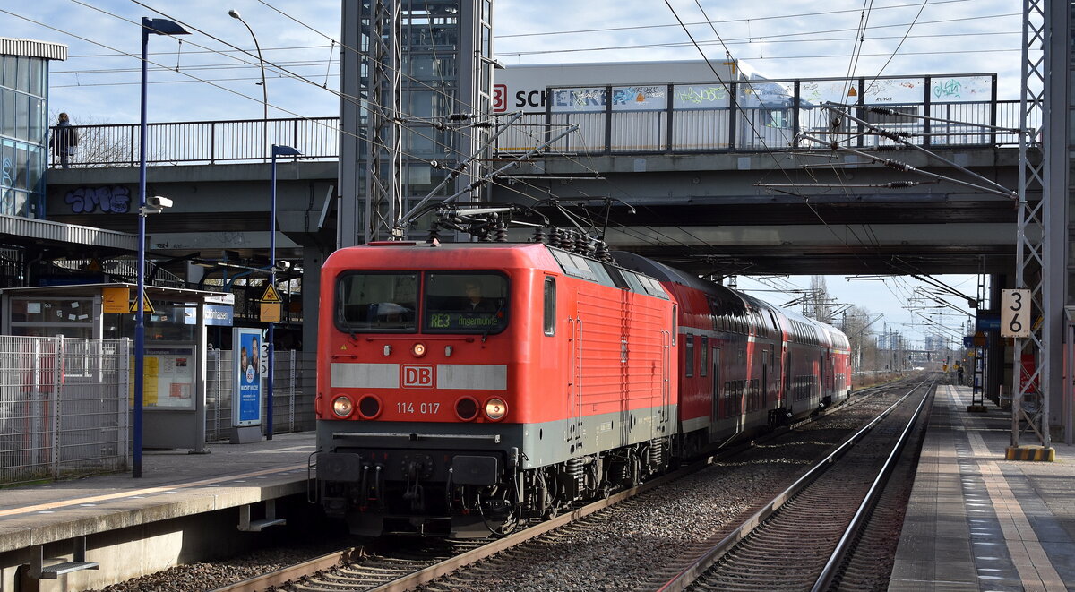 DB Regio AG - Region Nordost, Fahrzeugnutzer: Regionalbereich Berlin/Brandenburg, Potsdam mit ihrer "114 017" (NVR: "91 80 6114 017-7 D-DB") fährt zur Bereitstellung als RE3 nach Angermünde am 16.02.24 Durchfahrt Bahnhof Berlin-Hohenschönhausen.
