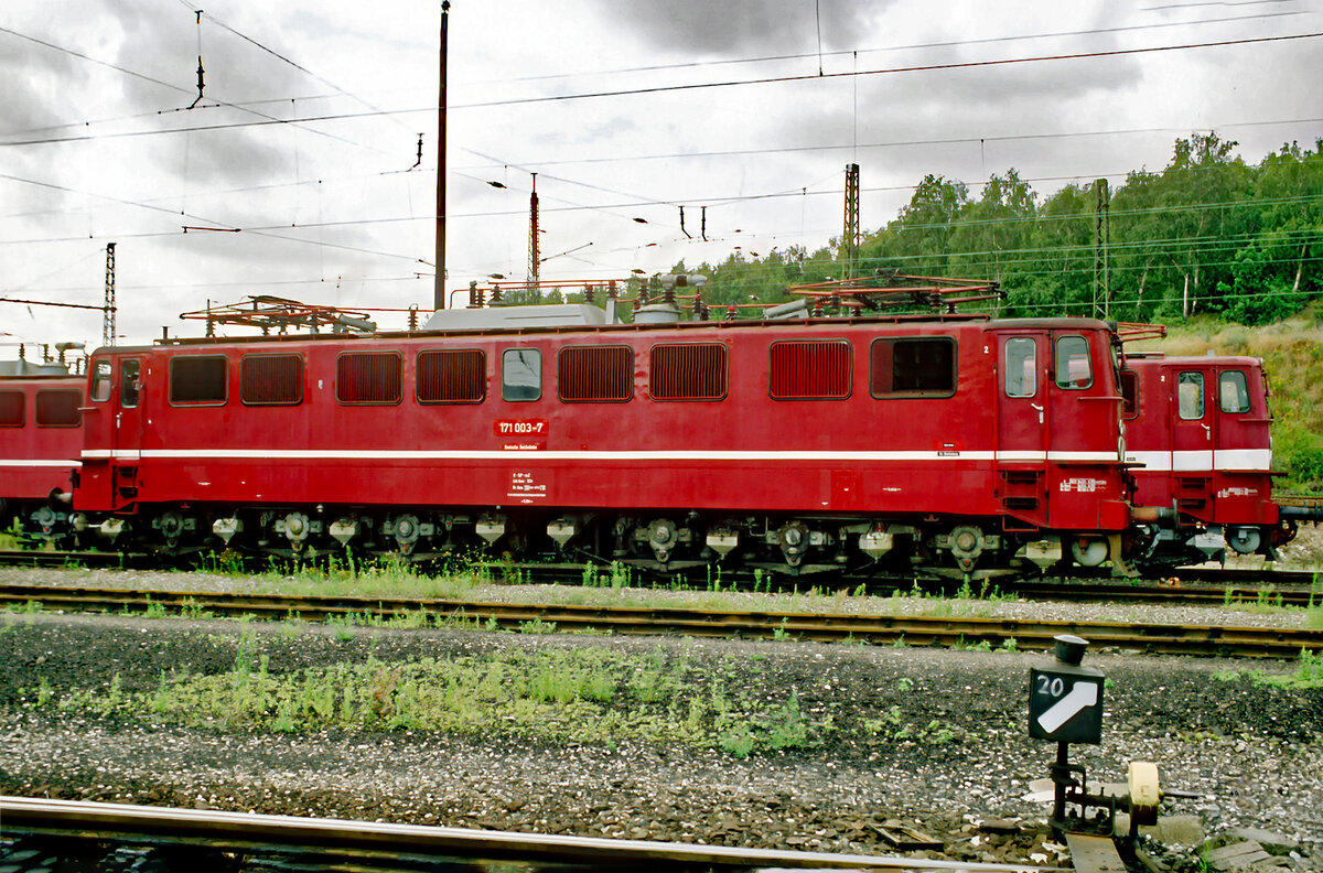 Die Steilstreckenlok 171 003 am 15.08.1992 im Bw. Blankenburg.