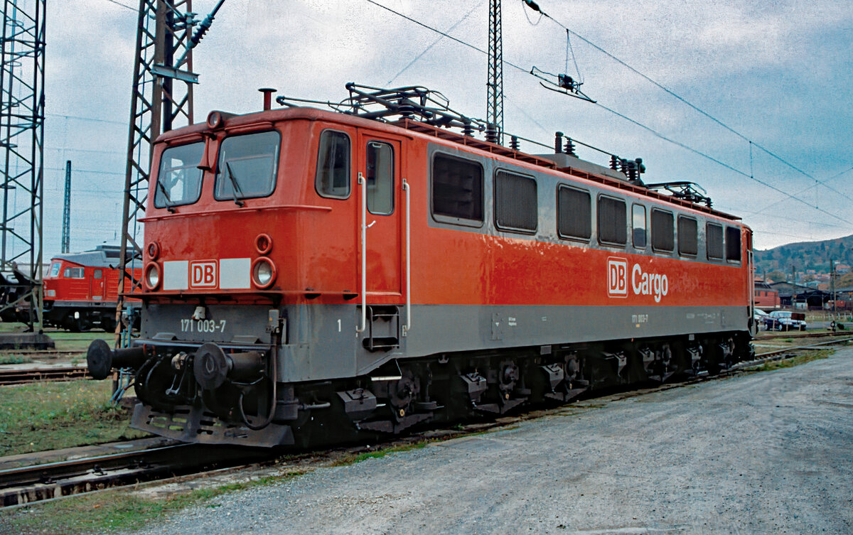 Die verkehrsrote 171 003 der DB Cargo am 03.11.2001 im Bw. Blankenburg.