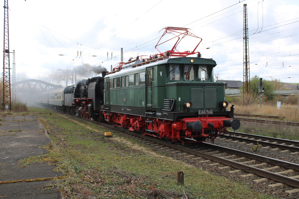 Nachdem es am Morgen des 25.06.2011 im Hbf.Halle/Saale zu einem Zusammentreffen mit E18 047 gekommen war, ist E44 044 (hier mit EDV-Beschilderung) mit dem Leipziger Museumszug auf dem Weg zu PIKO nach Sonneberg. Hier wird gerade südlich von Halle die Saale überquert.