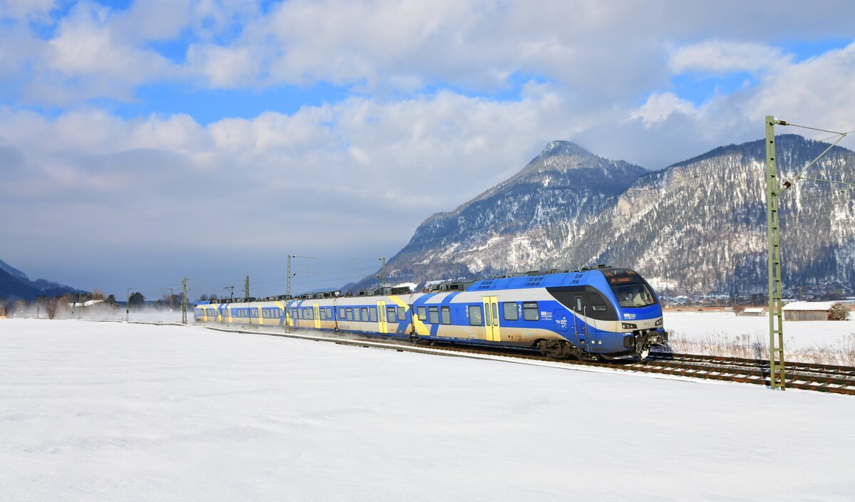 Über Rosenheim hing eine dichte Wolkendecke, als ET 312 der BRB (1430 012) am 11.01.2026 als RB 79069 auf dem Weg von München Hbf nach Kufstein die verschneiten Felder bei Oberaudorf passierte.