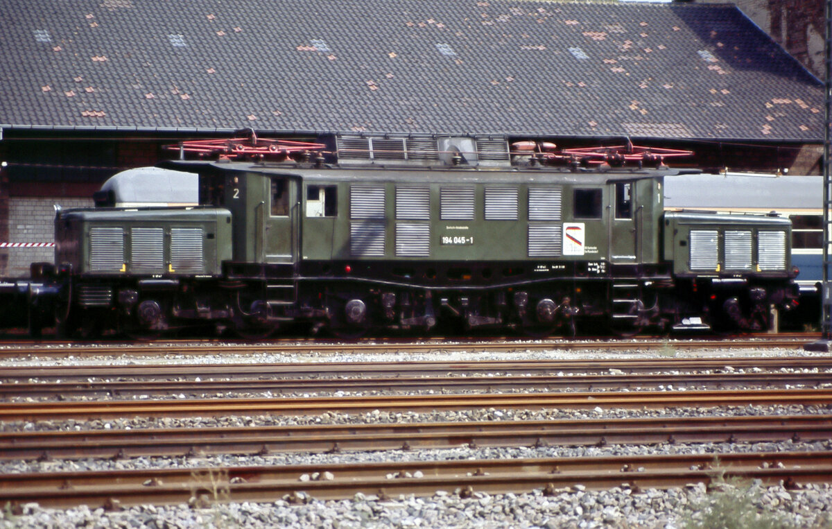 Die noch im Betriebsdienst der DB befindliche 194 045 am 21.09.1985 im Gbf. Mannheim. AEG lieferte 1941 die Lok, 1887 wurde sie ausgemustert und 1988 zerlegt.