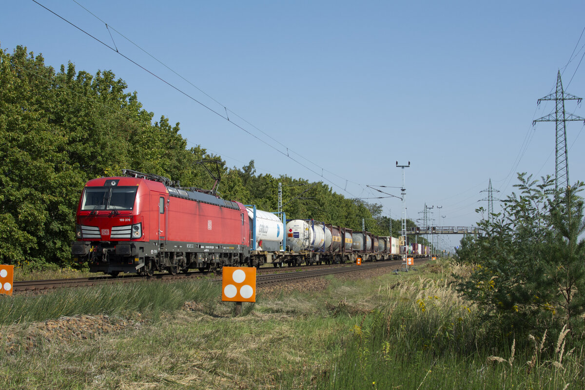 Was ist an 193 378 so besonders? Der Zug kam aus Frankfurt Oder und kam am südlichen Berliner Außenring vorbei an Wassmannsdorf , am 16.09.2020. Zur Frage: es sind 3 weiße Streifen am ,,Grill,,. Heute sieht man nur noch zwei, warum?