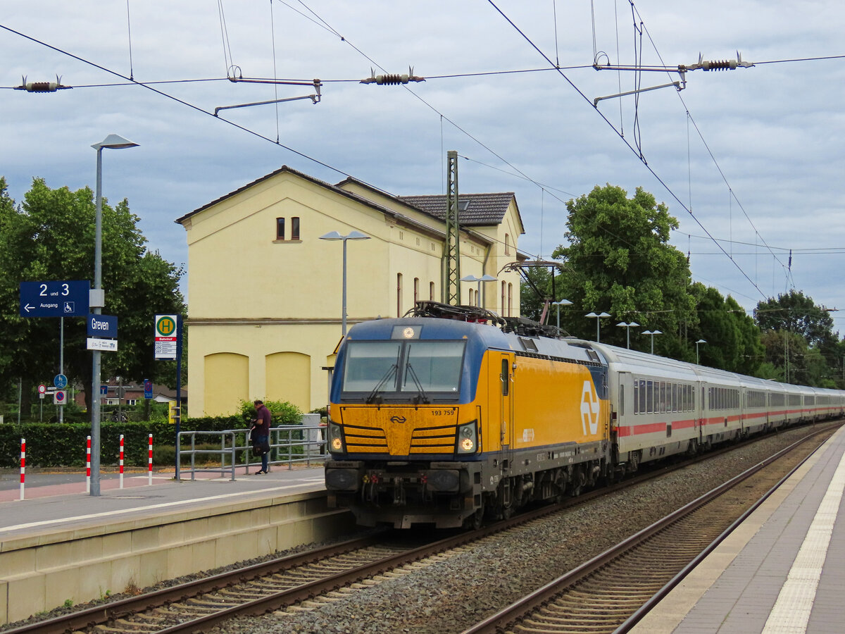193 759 fährt mit einem Umleiter IC Berlin-Amsterdam über Hannover-Altenbeken-Hamm-Münster-Rheine auf dem letzten Stück der Umleitung durch Greven Richtung Rheine. Juli 2025