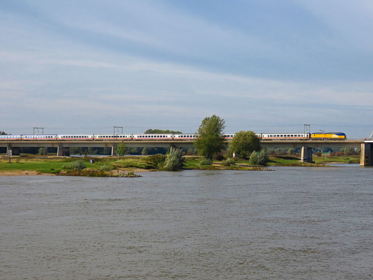 Ein IC mit niederländischer Vectron von Amsterdam nach Berlin überquert die Ijssel kurz vor Deventer. Als die Fernverkehrszüge noch Zuglaufnamen hatten, verkehrten die IR/IC-Züge auch unter dem Namen Ijsselmeer. Oktober 2025 Bern hard
