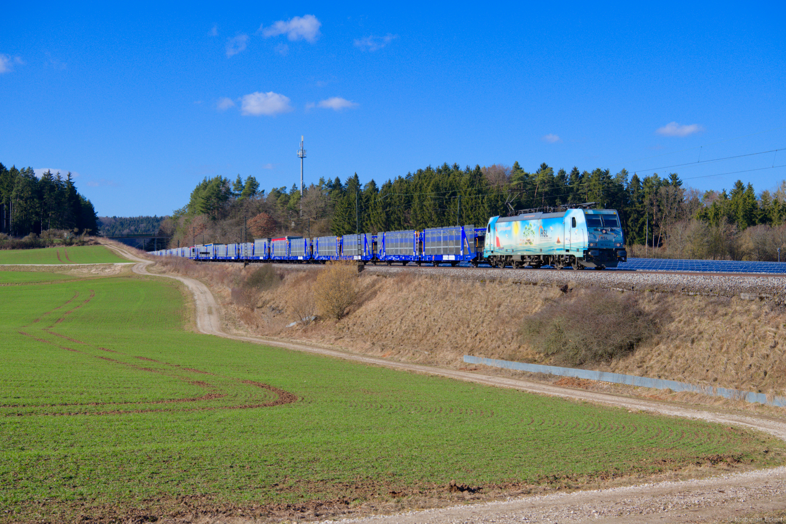 HSL 186 551-8 mit einem Ganzzug Autotransportwaggons am Fotobaum bei Retzbach im Maintal. Der Zug fuhr im Gegengleis in den Bahnhof Retzbach um dort zu pausieren. 22.03.2026 Matthias Kümmel