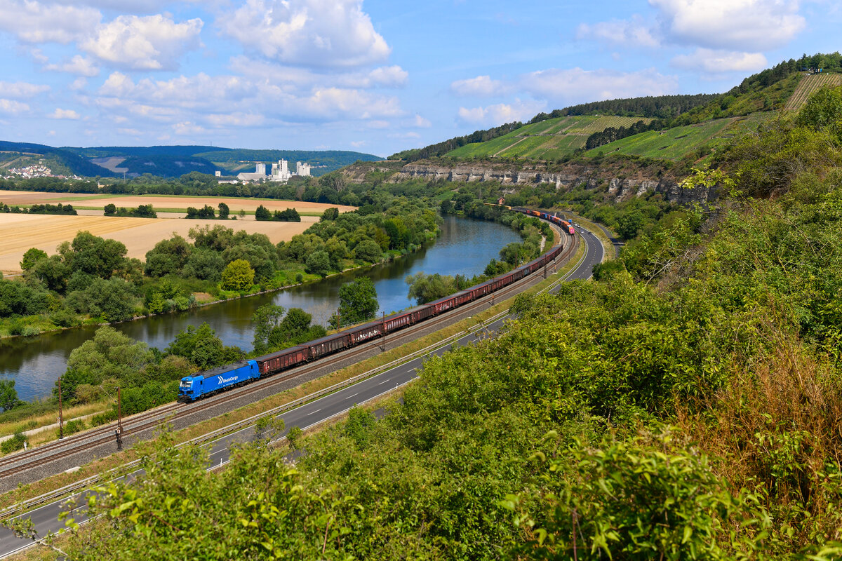 Eine interessante Leistung, zu der ich im Nachgang nichts weiteres recherchieren konnte, begegnete mir am Vormittag des 18. Juli 2025 im Maintal. Die 192 056 von RheinCargo beförderte einen Ganzzug, bestehend aus Waggons der Gattung Tamns, in Richtung Würzburg. Diese werden gerne zum Transport von Ton nach Italien eingesetzt. Solche Züge sind auf der Main-Spessart-Bahn nichts ungewöhnliches. Allerdings habe ich bisher noch keine RheinCargo Lok davor beobachten können. Es handelte sich somit vermutlich um ein anderes nässeempfindliche Ladegut, welches hier befördert wurde. Die Aufnahme entstand zwischen Karlstadt und Himmelstadt, ein Containerzug räumte noch rechtzeitig die Bildfläche.