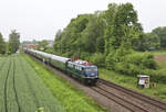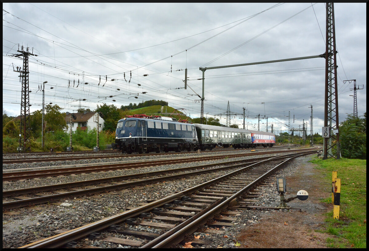 Die Bügelfalte 110 350-6 (TeutoLok) beförderte am 03.10.2024 zwei Reisezugwagen von Crailsheim nach Münster, am Mittag aufgenommen in Würzburg-Zell.