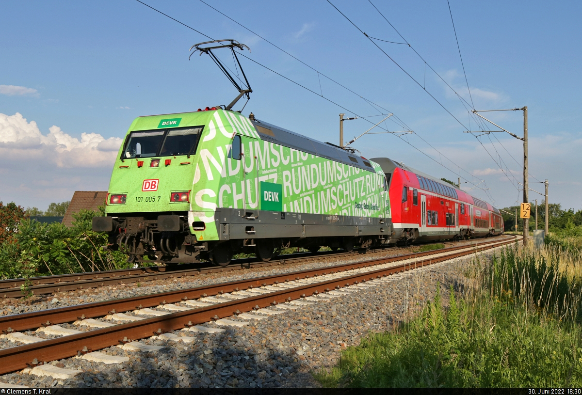 Nach dem nicht enden wollenden innofreight-Containerzug Richtung Halle (Saale) war die Anspannung groß, dass der durch Ostwind schon weithin hörbare PbZ nicht zugefahren wird. Es ging noch mal gut. Der DEVK-Werbeträger 101 005-7 führte den bunten Zug an und wurde an der ehemaligen Anrufschranke in Zscherben fotografiert.