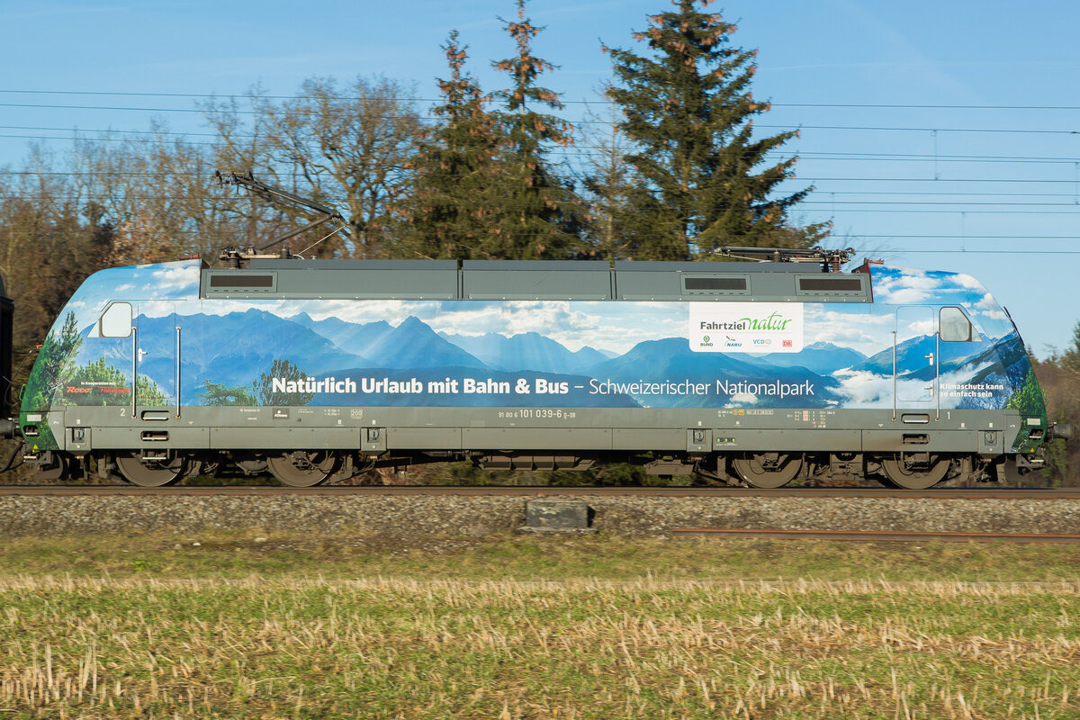 Werbelok 101 039 "Fahrtziel Natur - Schweizerische Naturpark"mit dem EC 2083 Königsee von Hamburg Altona nach Freilassing. am 26.12.24 bei Eglharting.