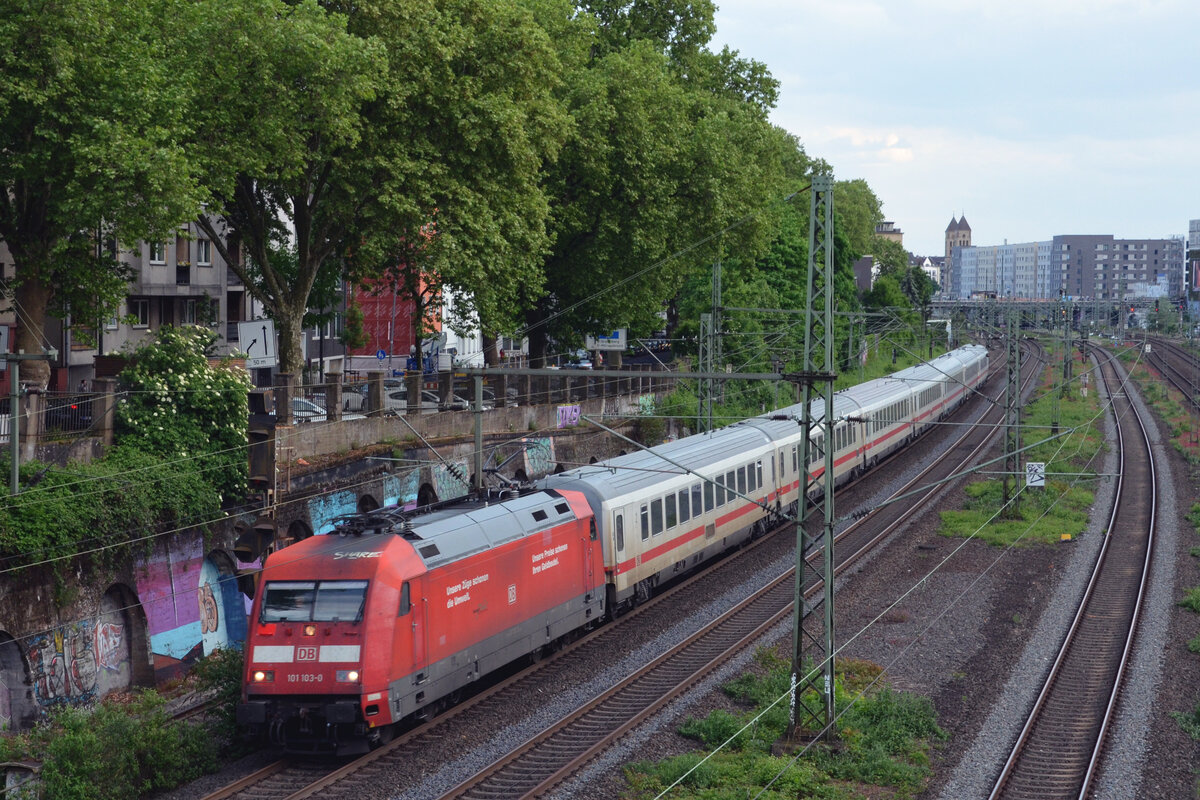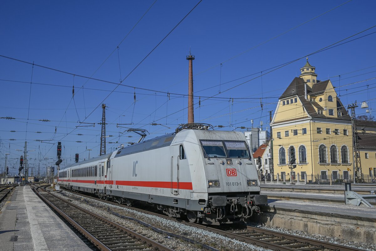 101 013 mit dem IC 2085 "Nebelhorn" Hamburg Altona - Augsburg - Oberstdorf, vereinigt mit IC 2083 "Königssee" Hamburg Altona - Augsburg - Berchtesgaden in Augsburg am 2.3.2025.
