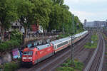 die eigentlich recht "gepflegte" 101 013-1 zeigt, wie ungeschickt helle Farben für Triebfahrzeuge sind, ist es nicht der Abgasruss der für Verschmutzung sorgt, so ist es wie hier, dass von den Bügeln herabtropfende Regenwasser der Fahrleitung.