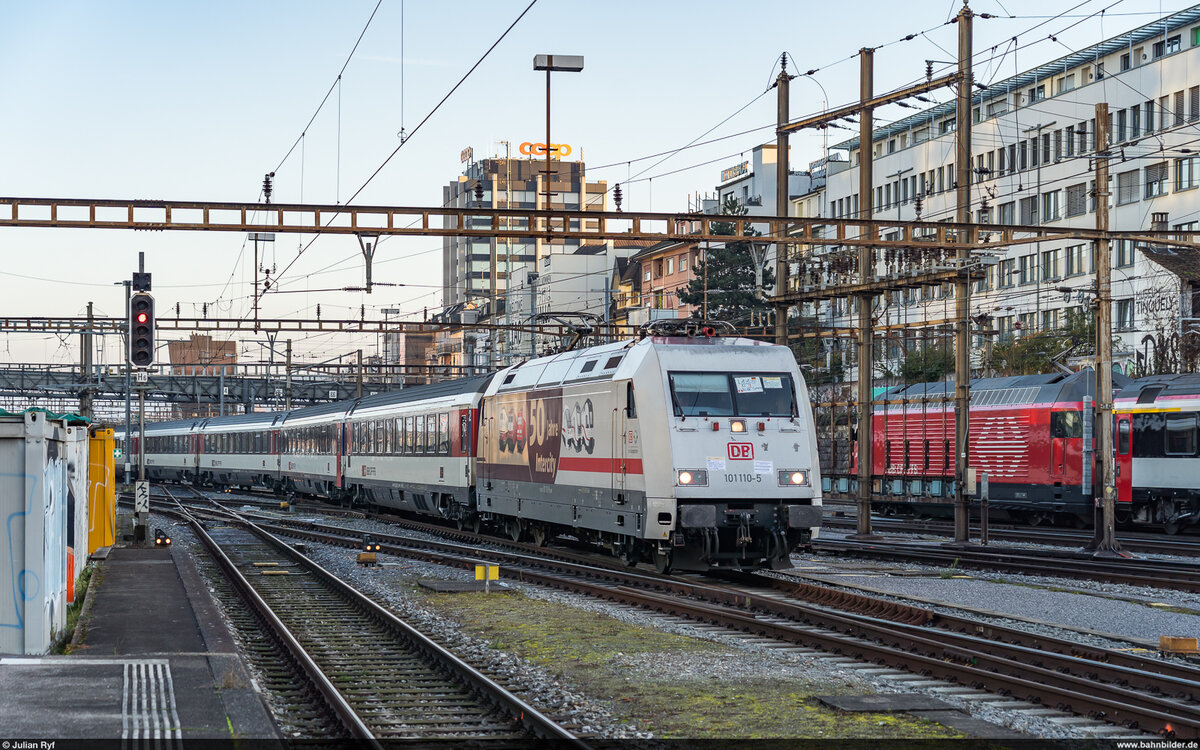 DB 101 057-8 "Europa" mit letzten EC7 nach Basel bei der Ausfahrt in Köln Hbf, Dezember 2025.