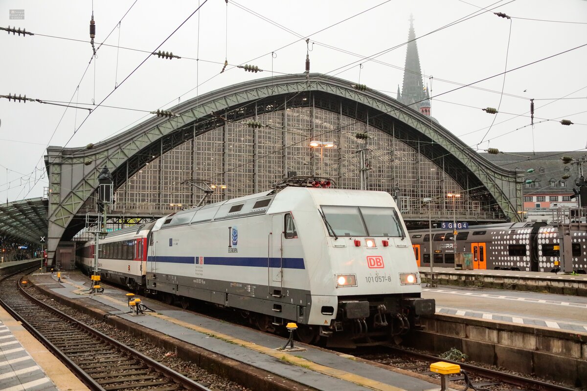 DB 101 110-5 "50 Jahre Intercity" mit letztem EC9 nach Basel in Köln Hbf, Dezember 2025. Zusehen die Zuglaufschilder & das HO Modell von DB 101 110-5 mit Eurocitywagen.