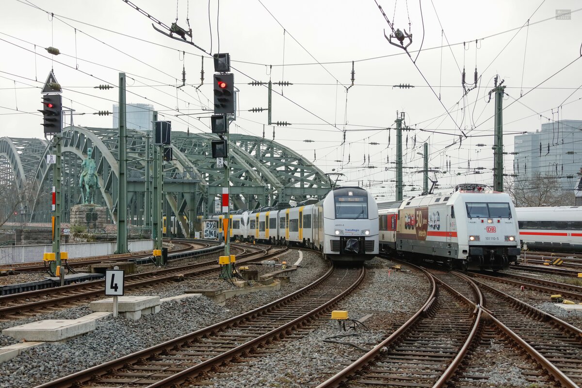 460 011-0 als RB26 nach Mainz & DB 101 110-5 "50 Jahre Intercity" mit EC7 nach Basel überqueren die Hohenzollernbrücke & fahren in Köln Hbf ein, April 2023.