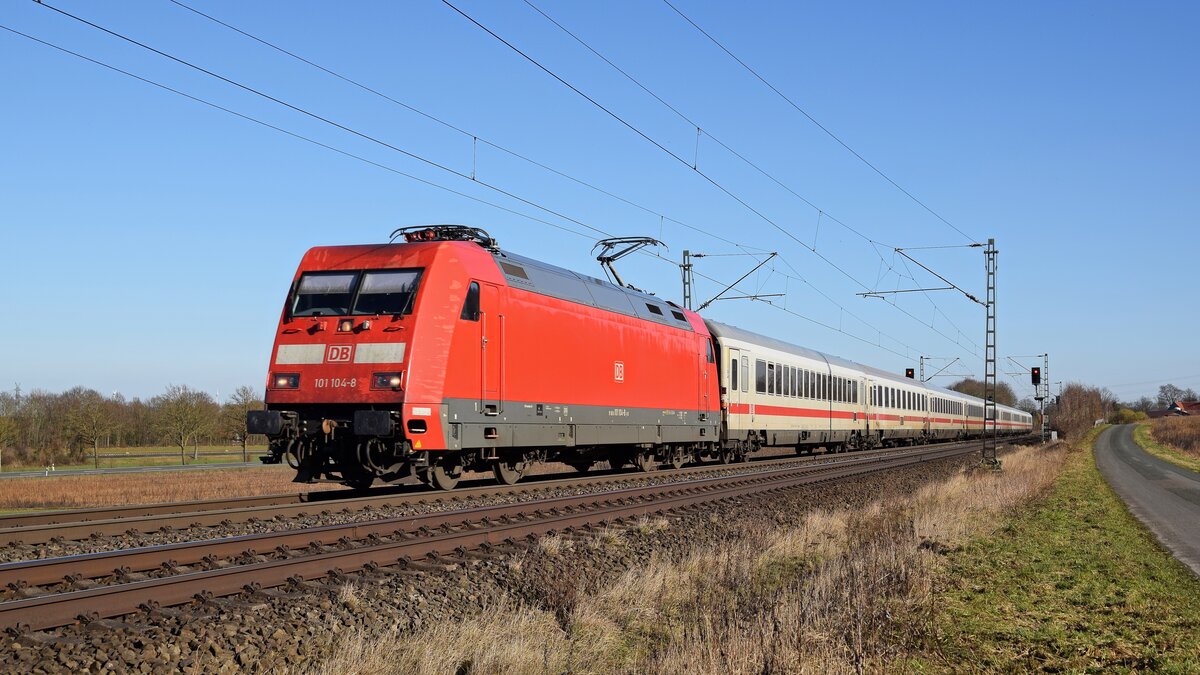 DB Fernverkehr 101 104-8 (91 80 6101 104-8 D-DB) mit IC 2311 "Nordfriesland" Westerland (Sylt) - Köln Hbf (Bohmte-Stirpe, 25.02.2026).