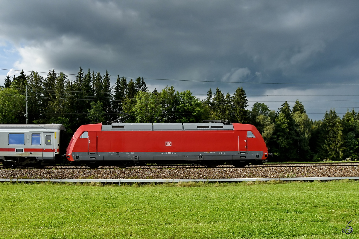 101 002-4 zieht einen IC in Richtung Salzburg. (bei Fuchsreut, August 2020)